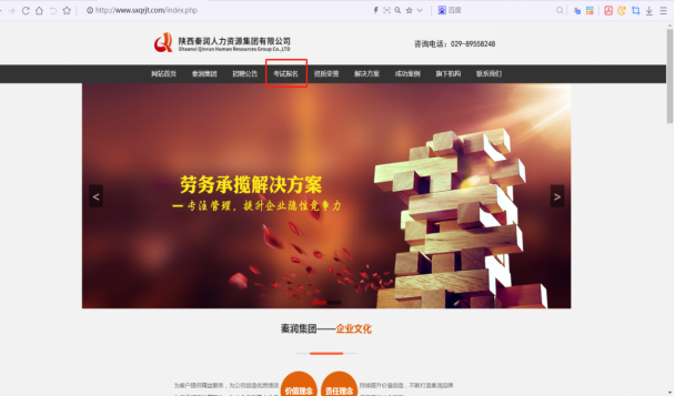 1.登錄陜西秦潤人力資源集團有限公司官網(wǎng)(網(wǎng)址:http://m.ahwyhb.com/),點擊“考試報名”。